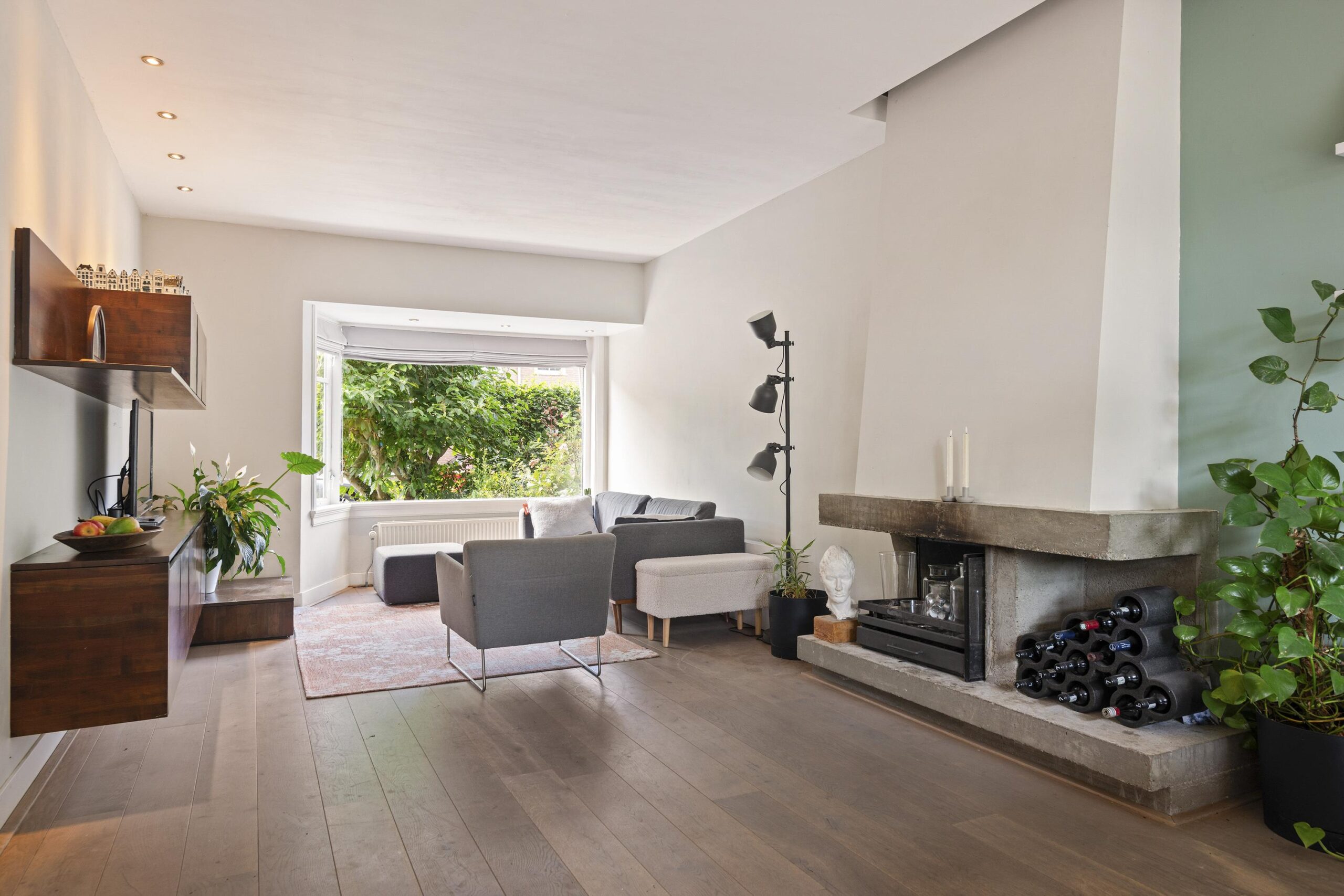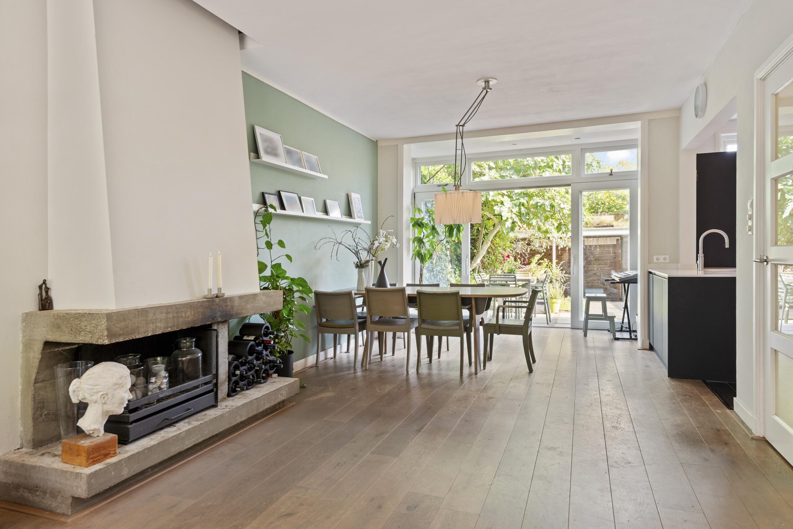 Begane grond: entree/hal met trapopgang, toegang naar provisiekelder, toilet met origineel fonteintje, de uitgebouwde woonkamer is voorzien van een open haard, houten vloer en schuifdeuren naar de tuin, de moderne open keuken is in 2020 geplaatst met complete ATAG inbouwapparatuur.