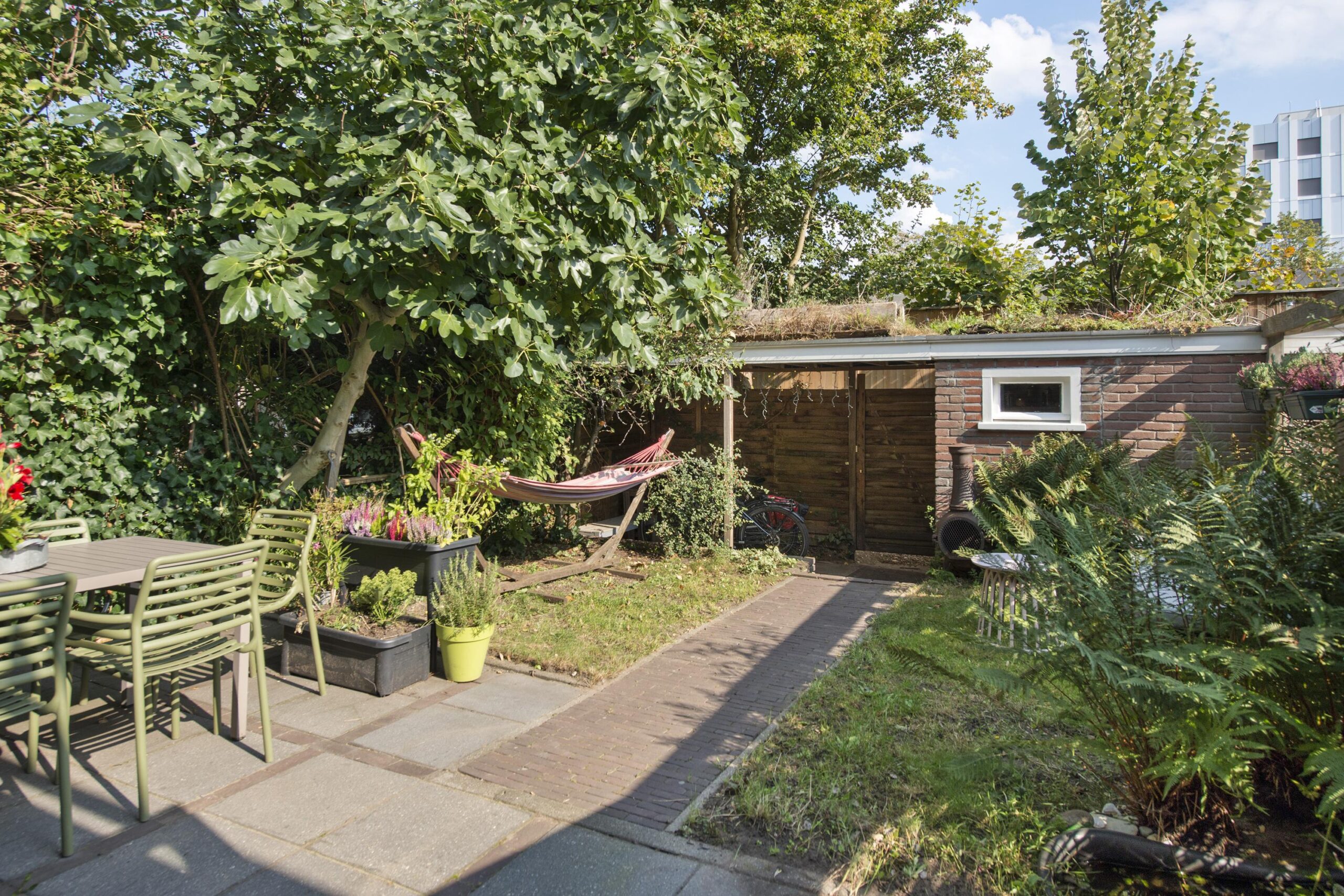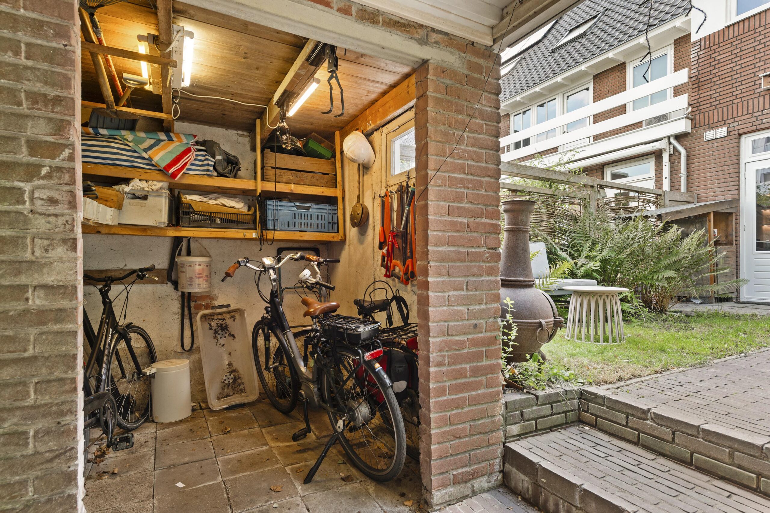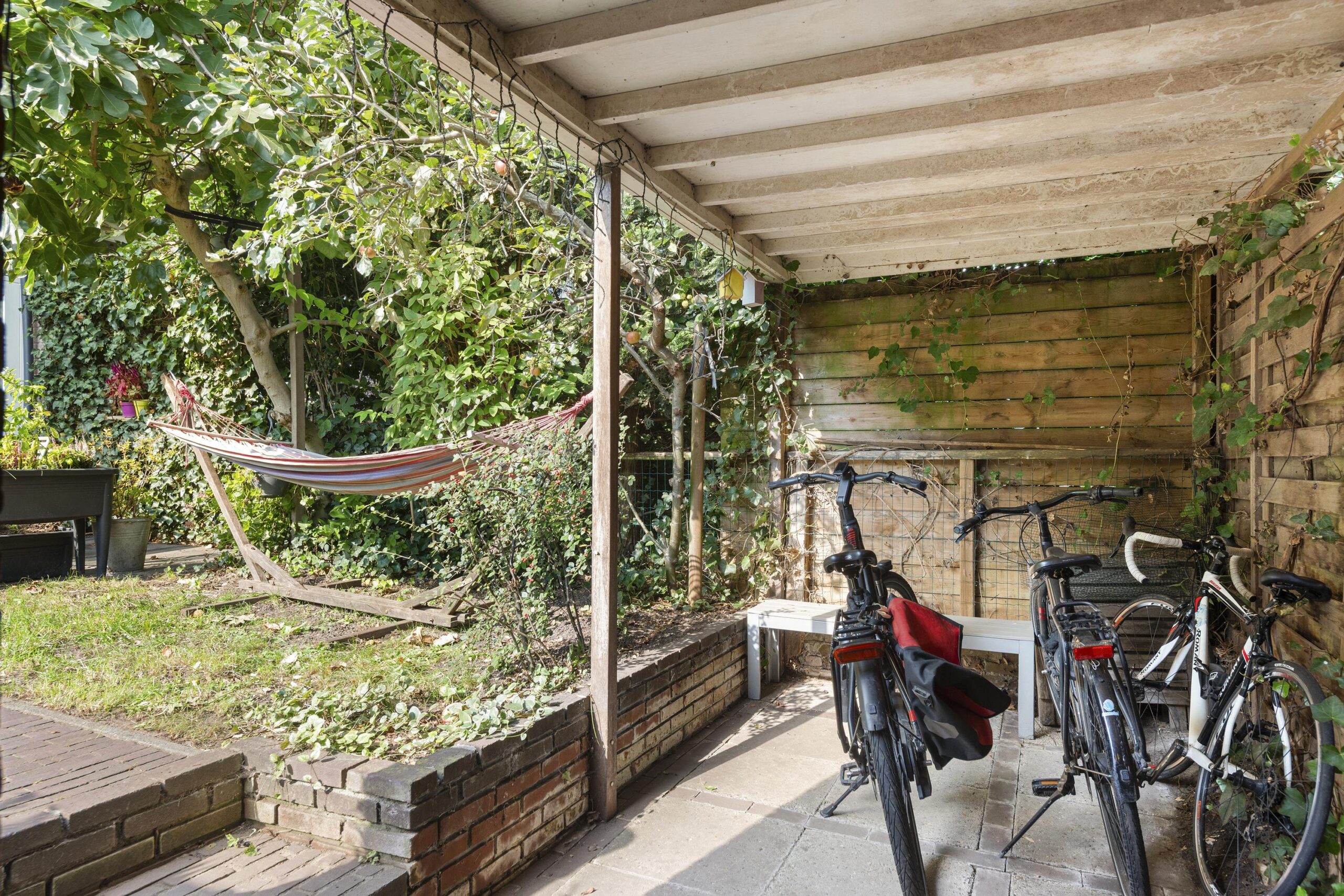 De achtertuin is gelegen op het oosten en voorzien van een stenen berging, extra ruimte voor de fietsen onder de overkapping en een achterom.