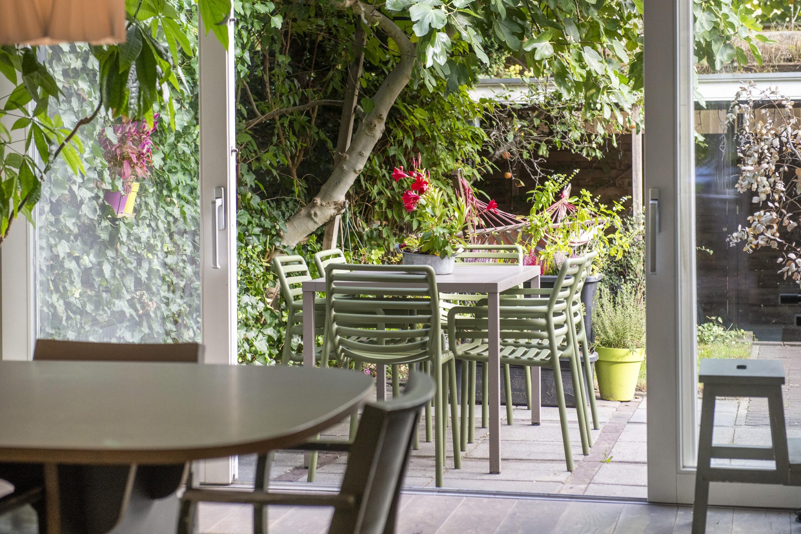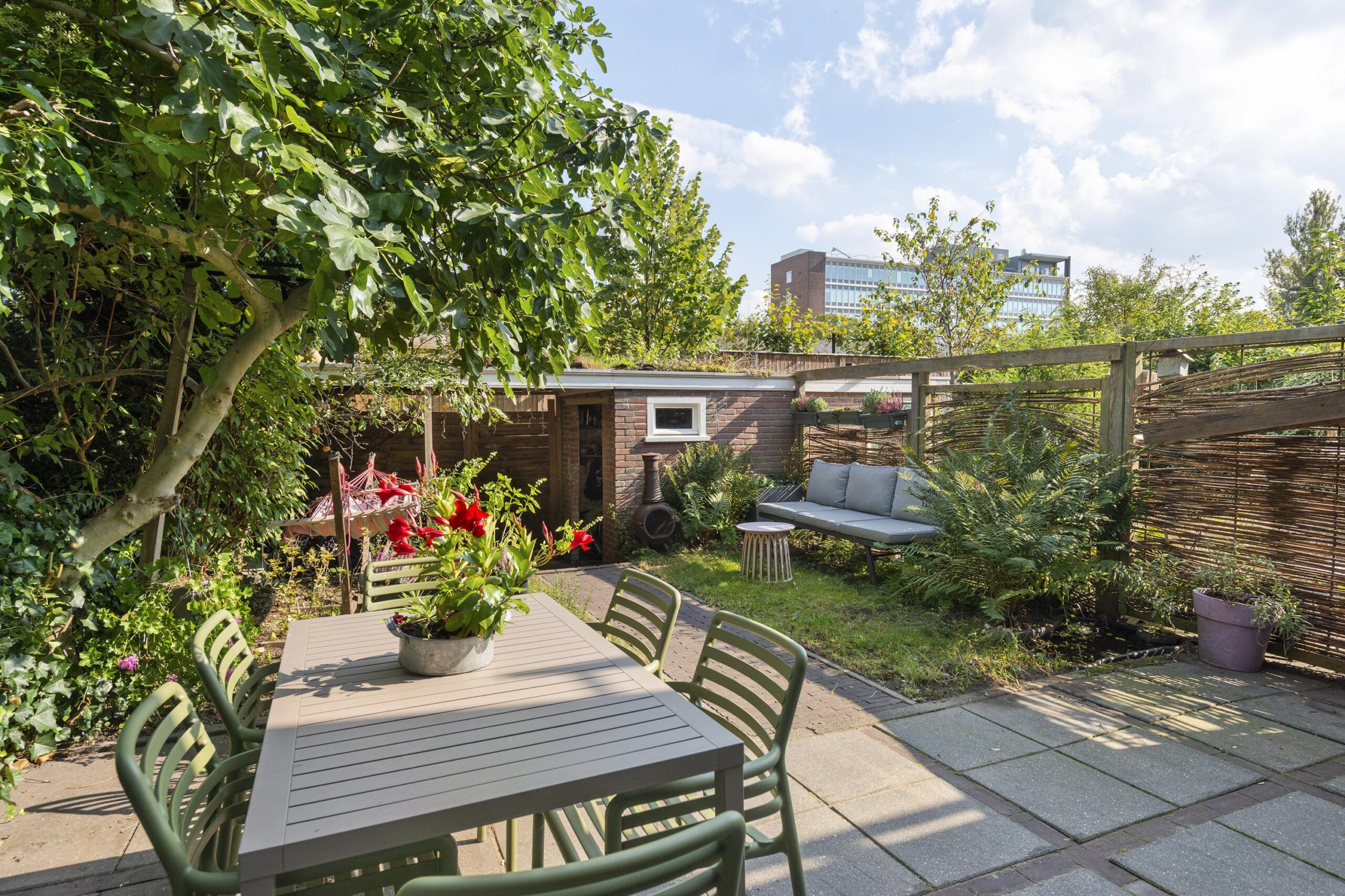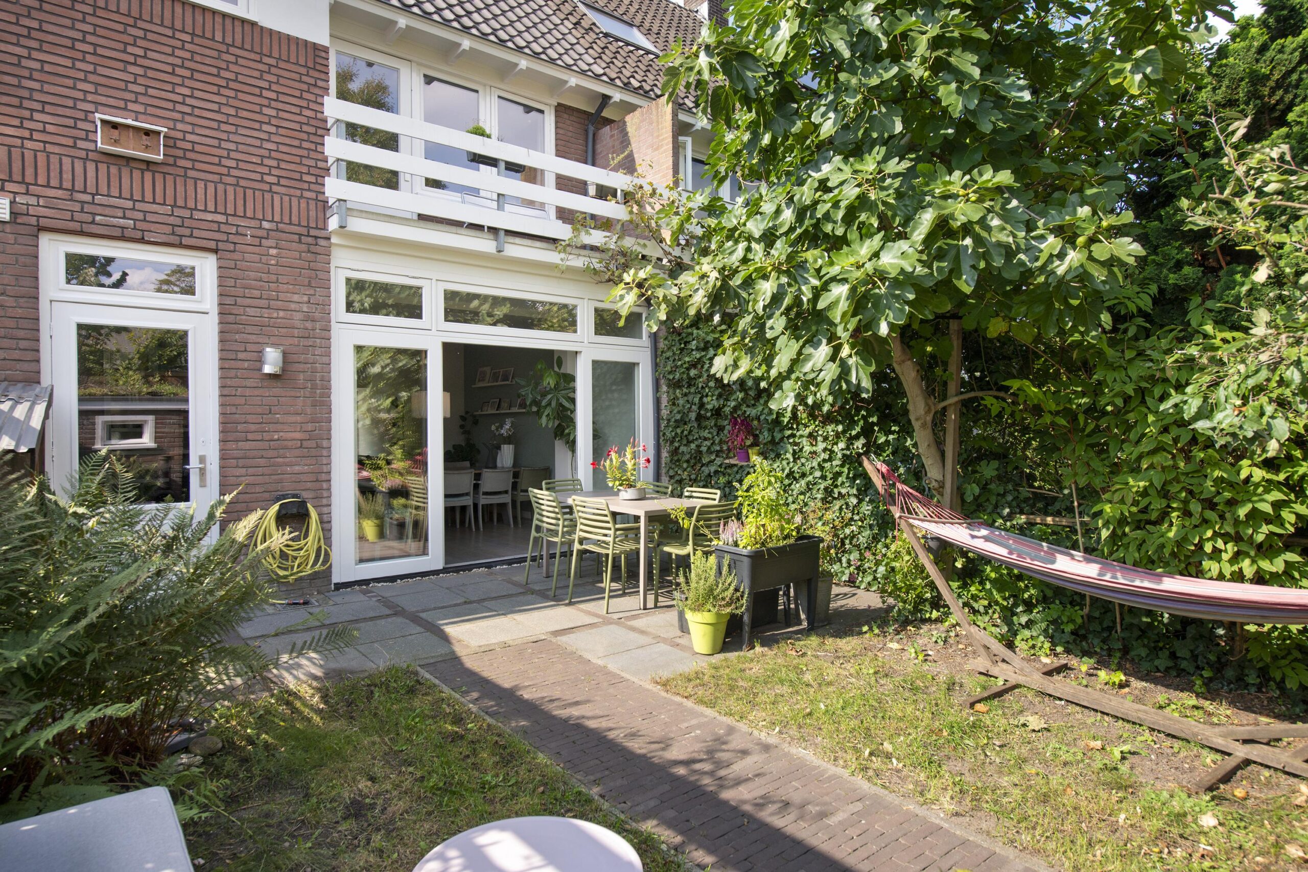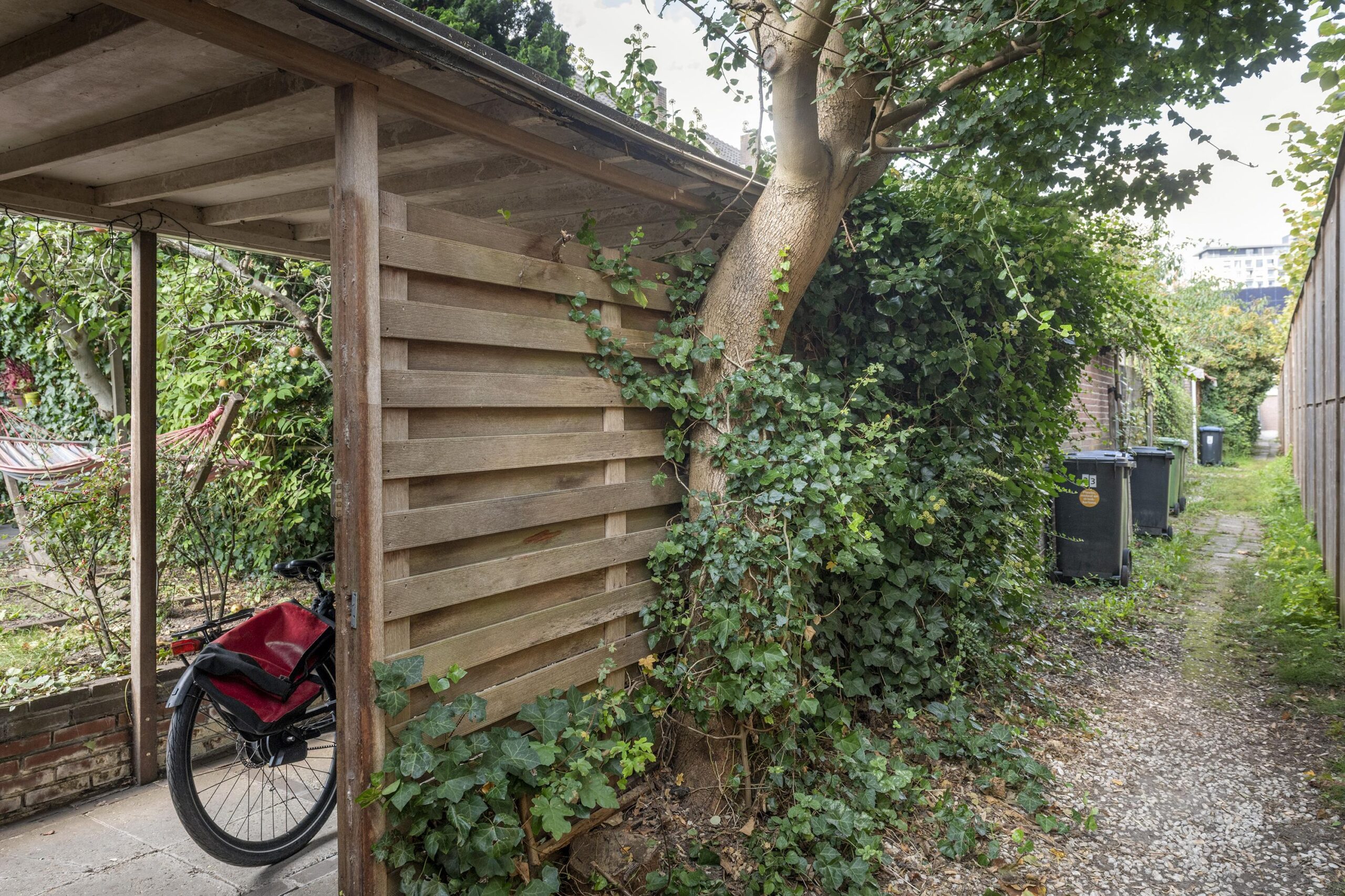 De achtertuin is gelegen op het oosten en voorzien van een stenen berging, extra ruimte voor de fietsen onder de overkapping en een achterom.