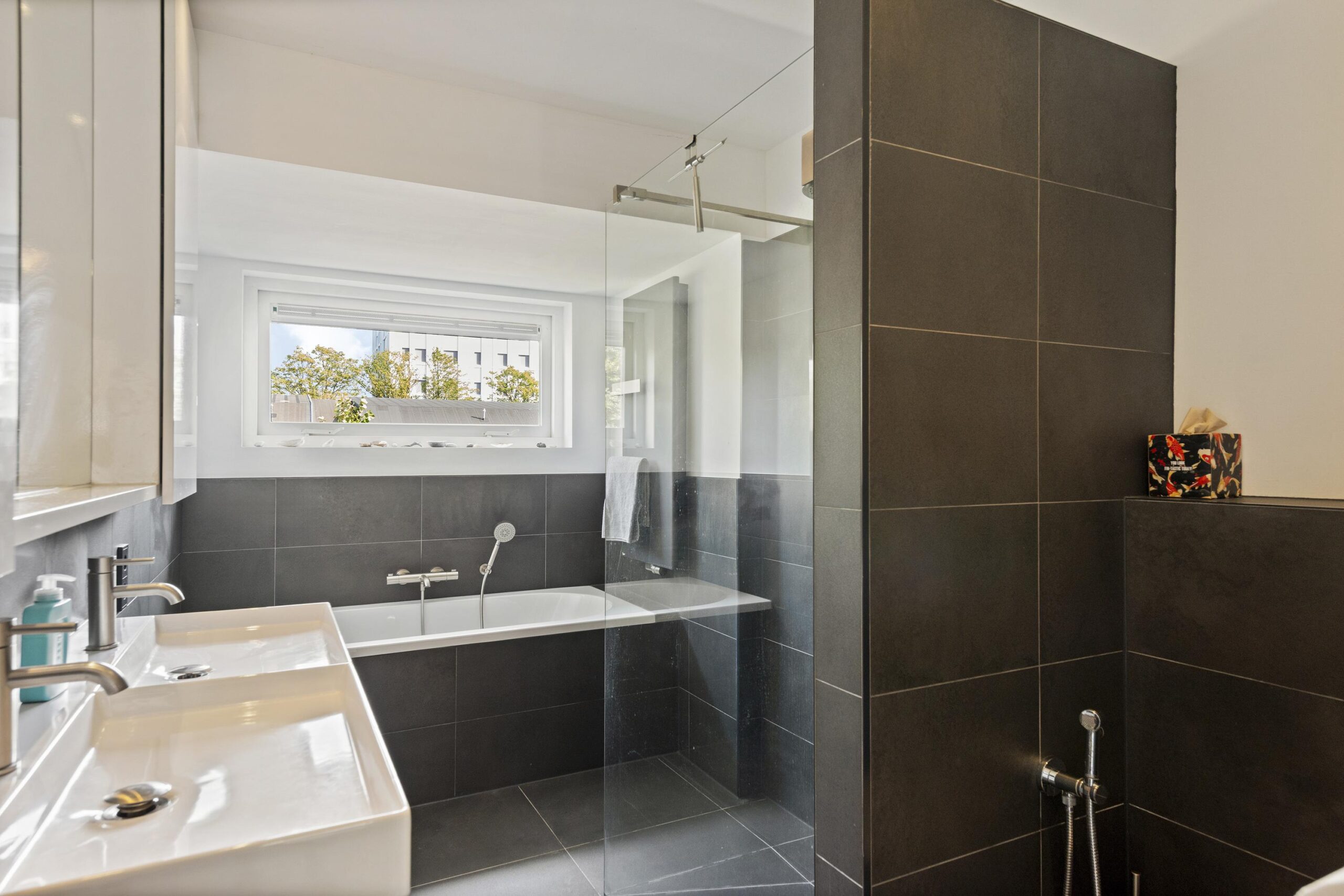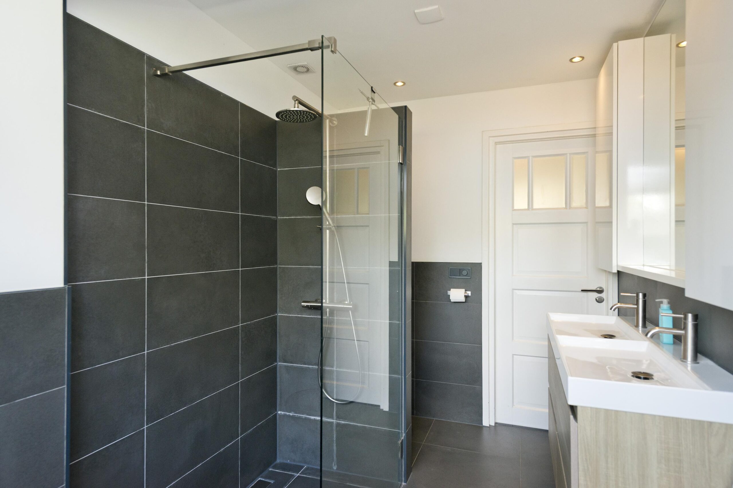 - Badkamer voorzieningen Ligbad, toilet, dubbele wastafel, wastafelmeubel, inloopdouche