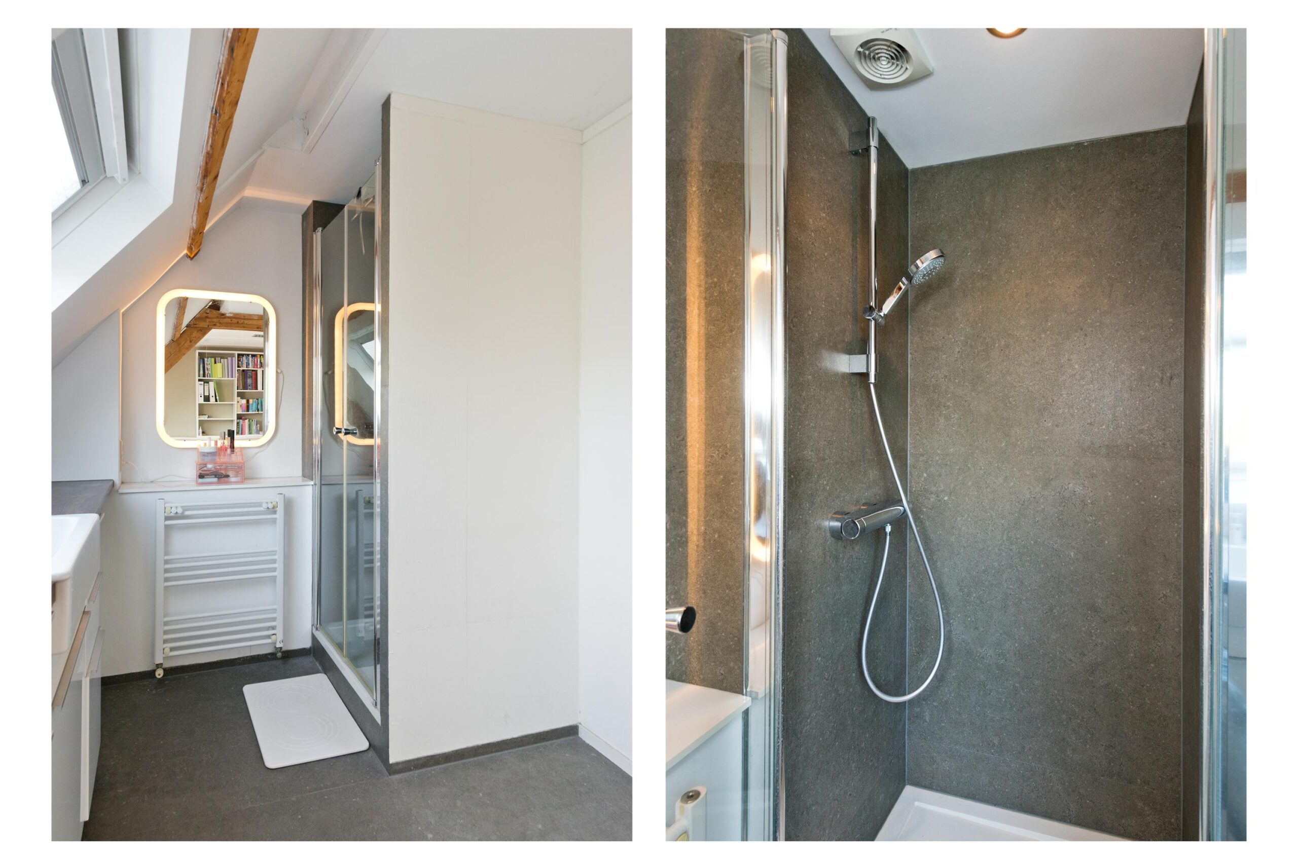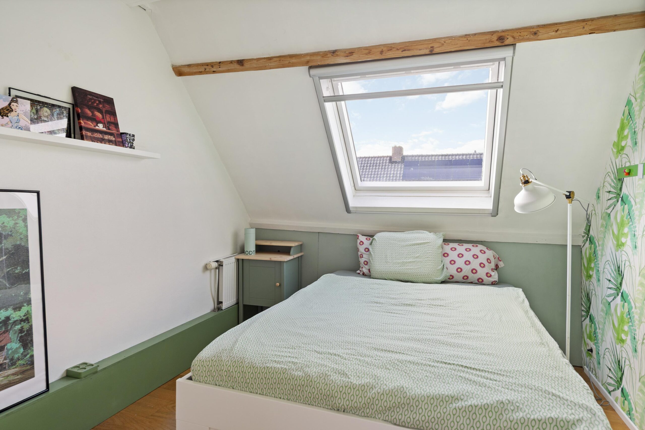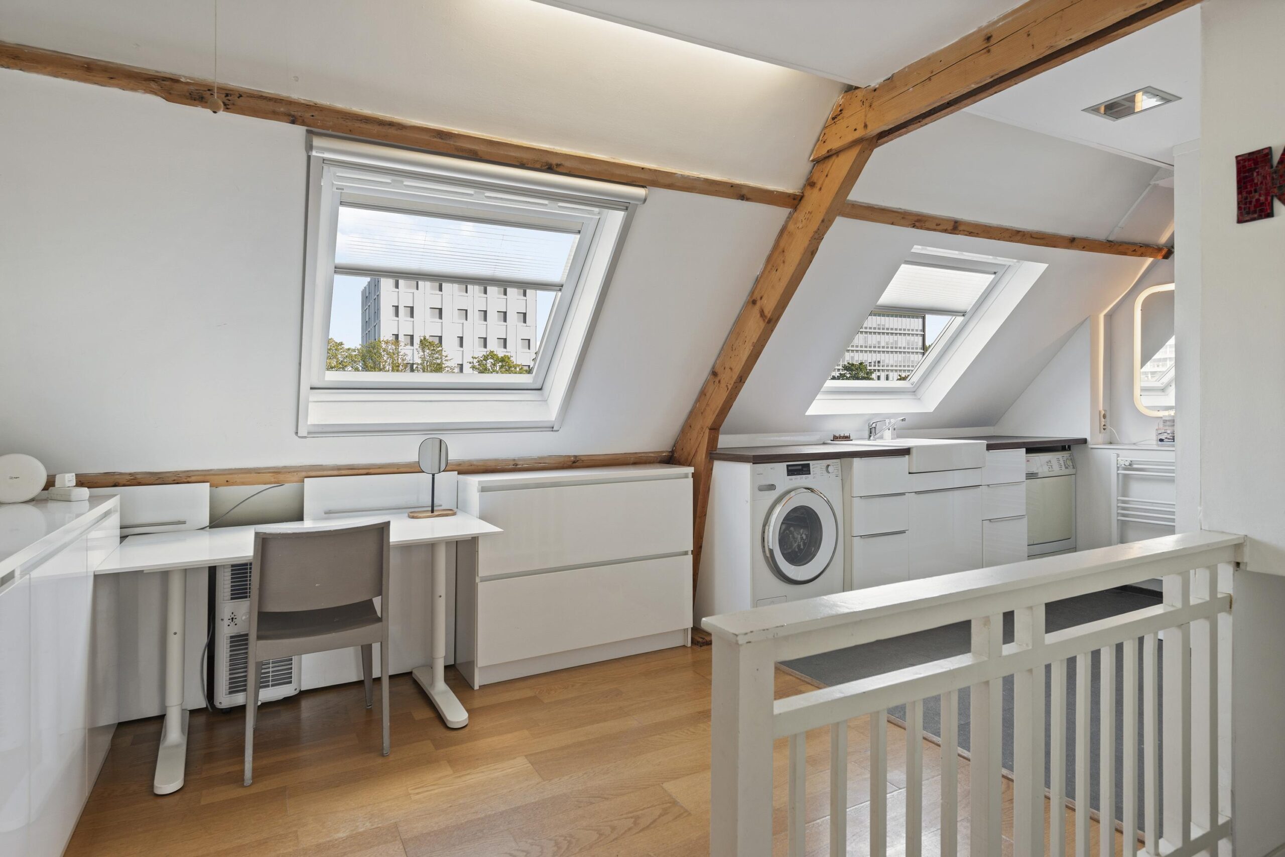 Tweede verdieping: Ruime voorzolder met grote dakramen en aansluitingen voor de wasmachine en droger, 2 slaapkamers en een 2e douchecabine met wastafel.