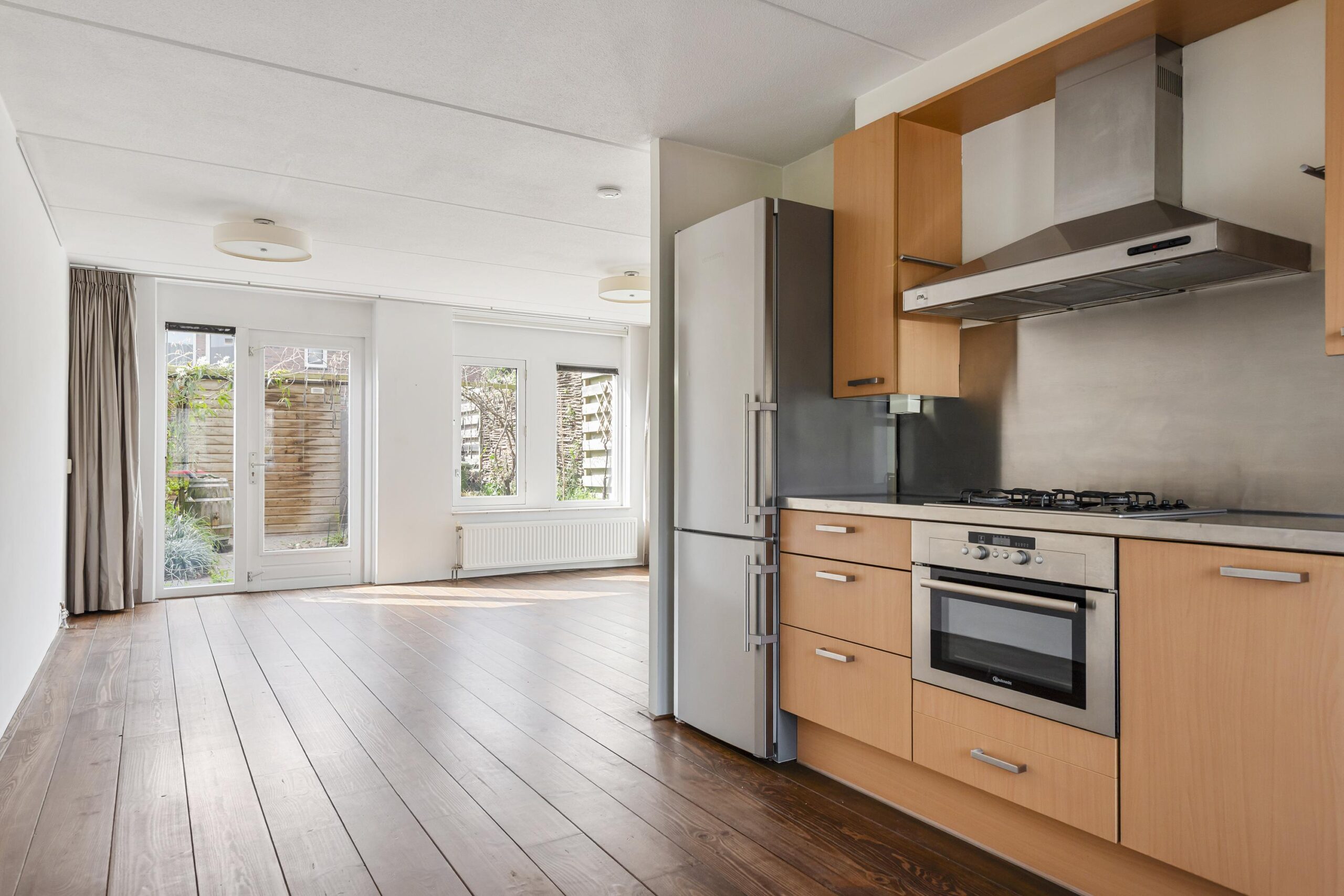 De begane grond van deze woning biedt een sfeervolle woonkamer met openslaande deur naar de tuin. De nette open keuken is voorzien van inbouwapparatuur. Een apart toilet met fonteintje en een trapkast maken het geheel compleet. De hal is voorzien van een meterkast, een trapopgang naar de verdieping en garderoberuimte.