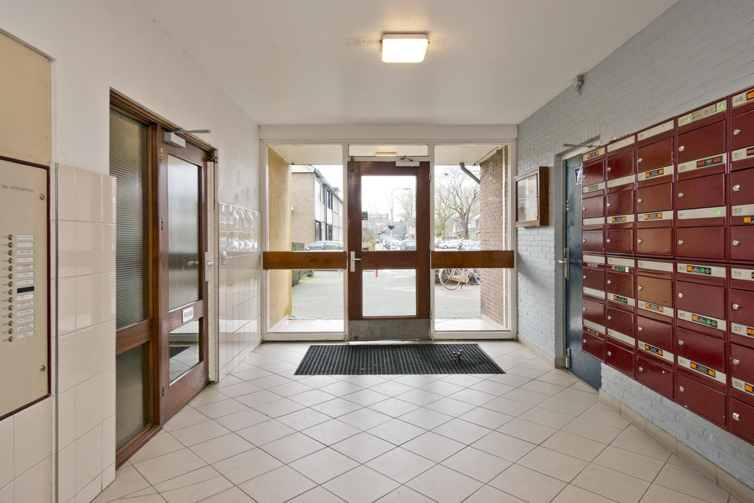 Begane grond: centrale entree met brievenbussen en toegang tot de bergingen, deur naar de lift en het trappenhuis.