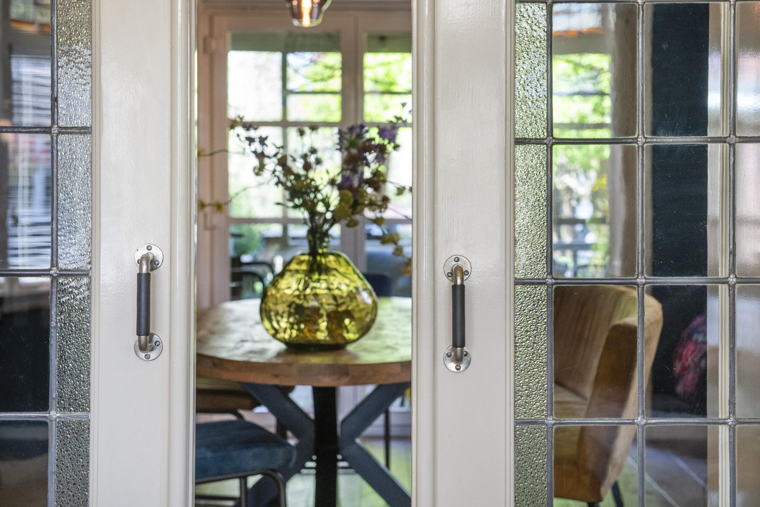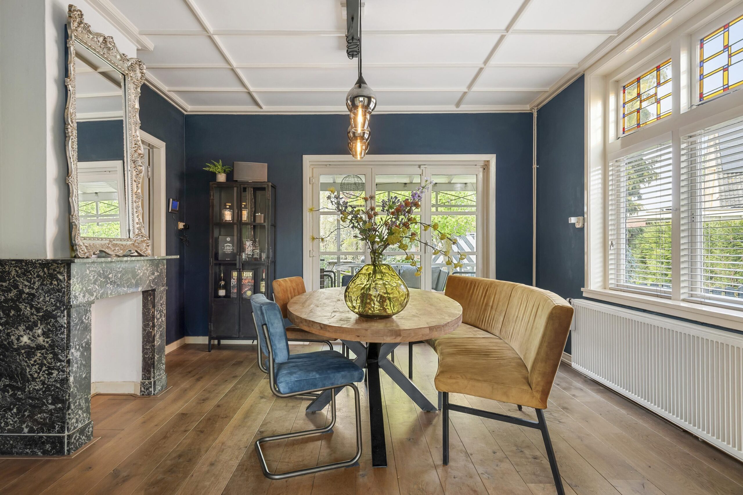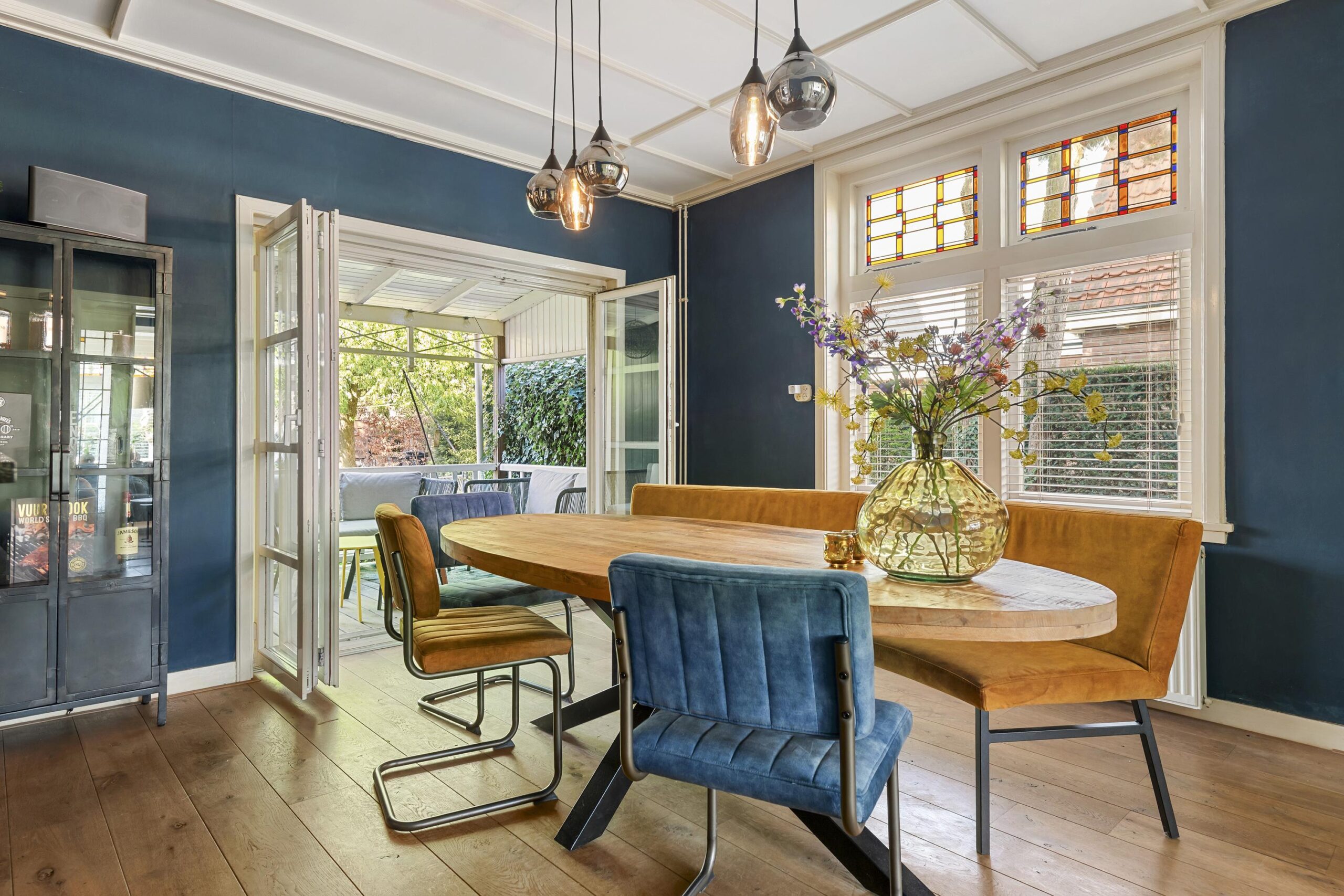 Begane grond: stijlvolle entree met een ruime hal met toegang tot de royale kelder (met stahoogte), garderoberuimte en de keuken. De zitkamer aan de voorzijde wordt gekenmerkt door een fraaie erker en fijne lichtinval. De en-suite indeling met glas-in-lood schuifdeuren verbindt de zitkamer met de sfeervolle eetkamer met authentieke schouw en vaste kasten. Via een harmonicadeur vloeit de eetkamer naadloos over in de veranda.