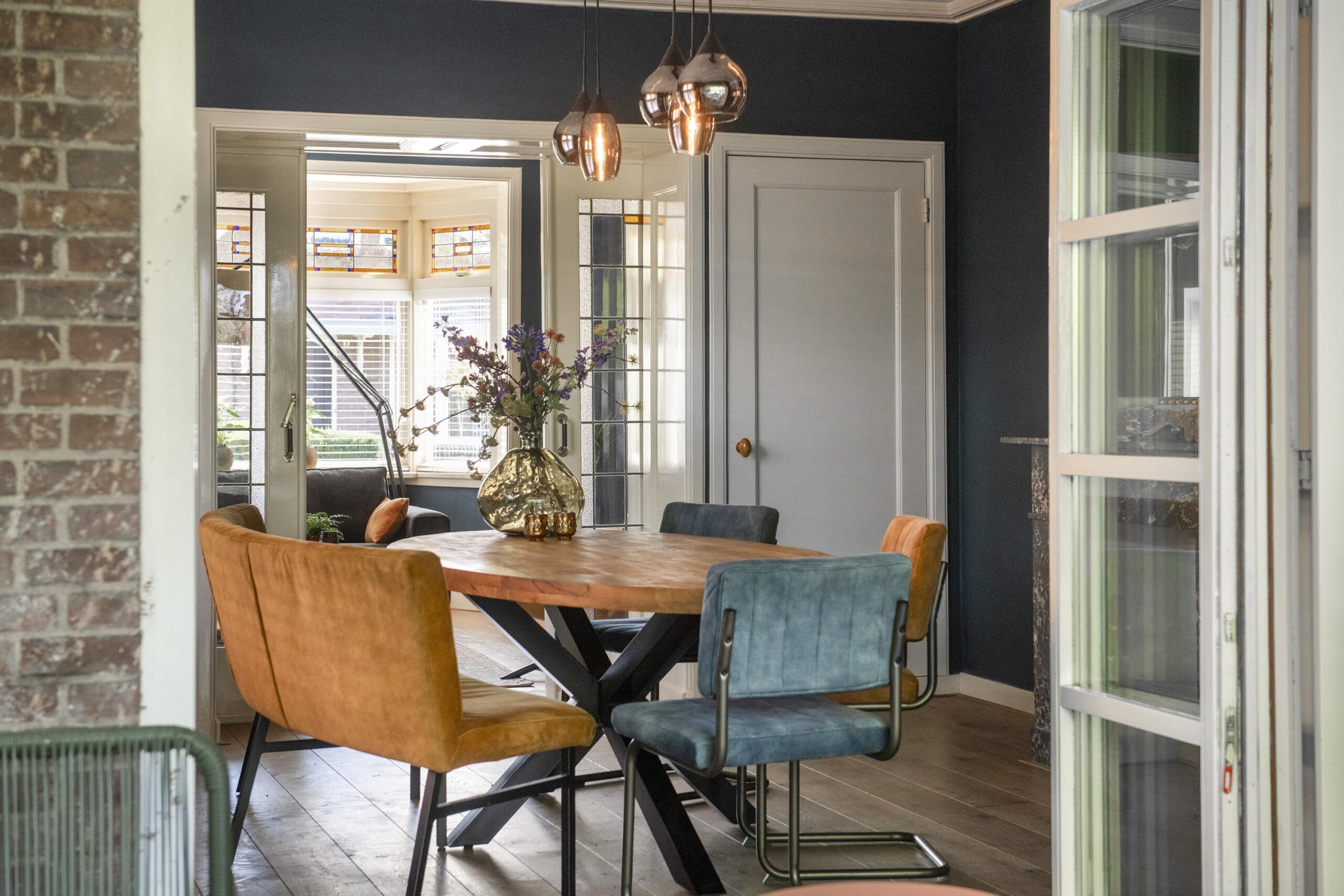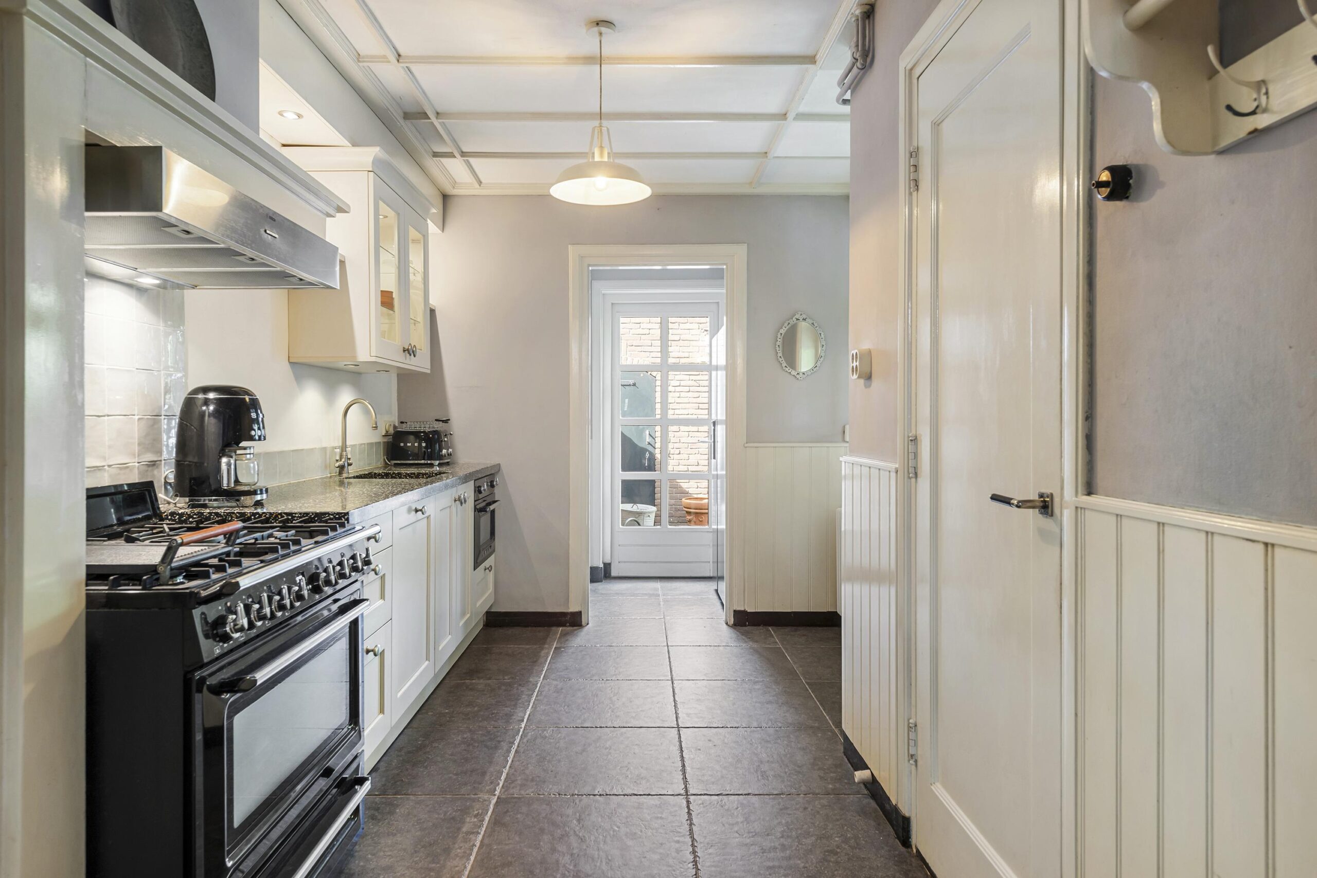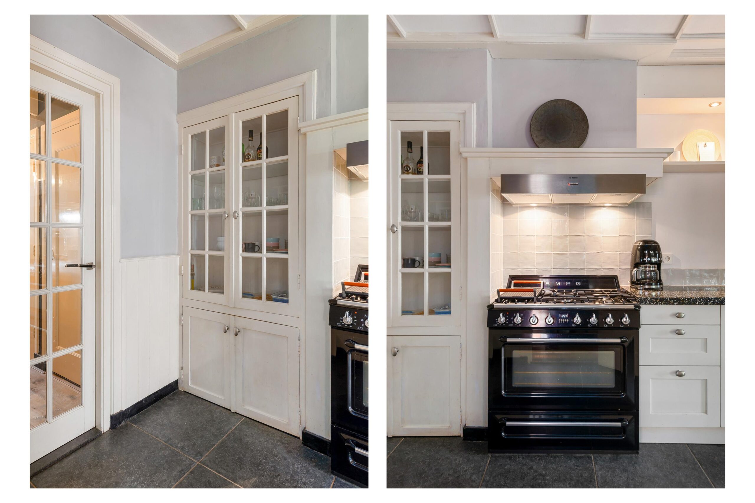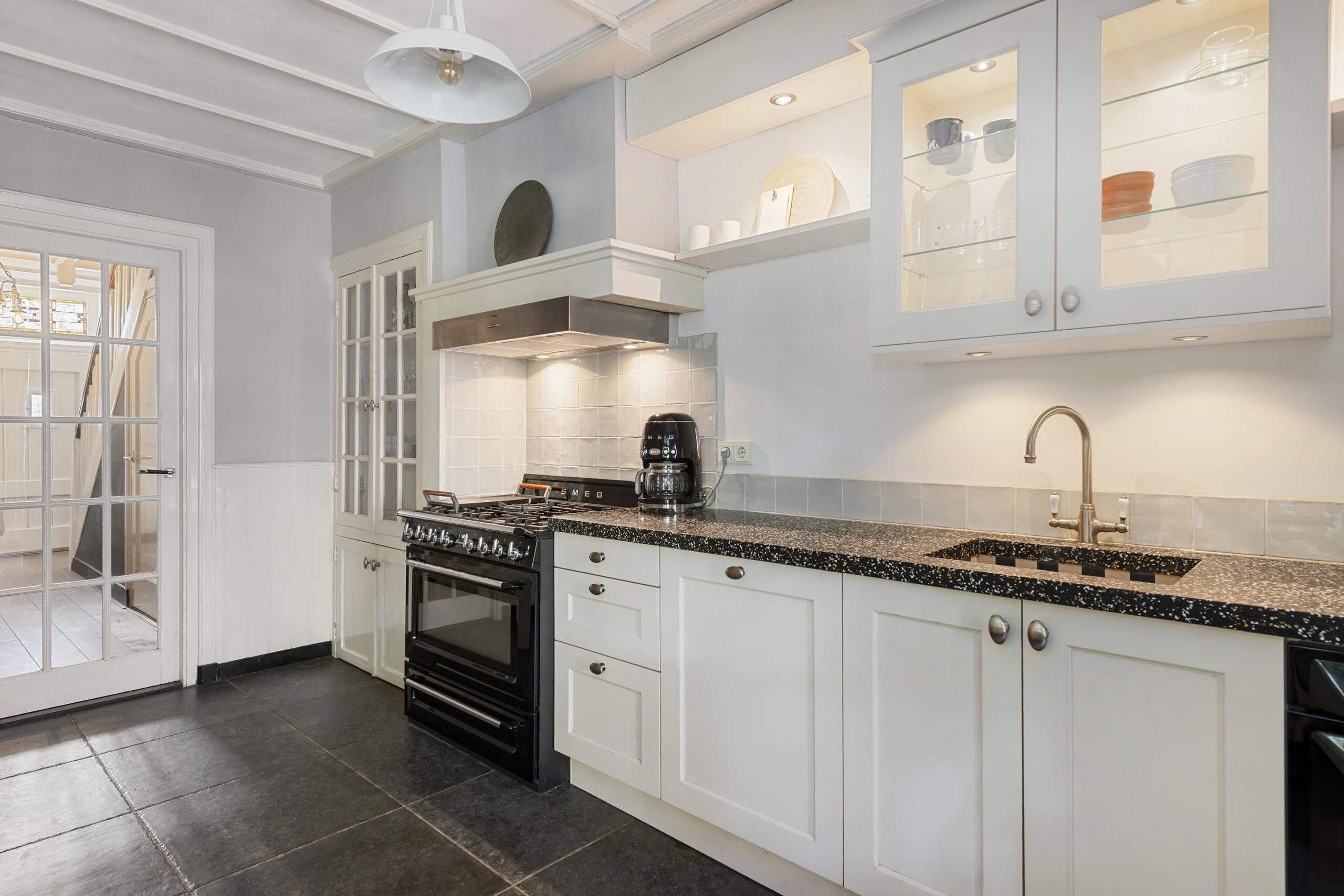 De halfopen keuken is uitgerust met kwalitatieve inbouwapparatuur, waaronder een SMEG gaskookplaat met oven, vaatwasser en SMEG combi-oven. De originele servieskast en schouw geven deze ruimte een warm karakter. Aansluitend bevindt zich de achterhal met een modern toilet en fonteintje.